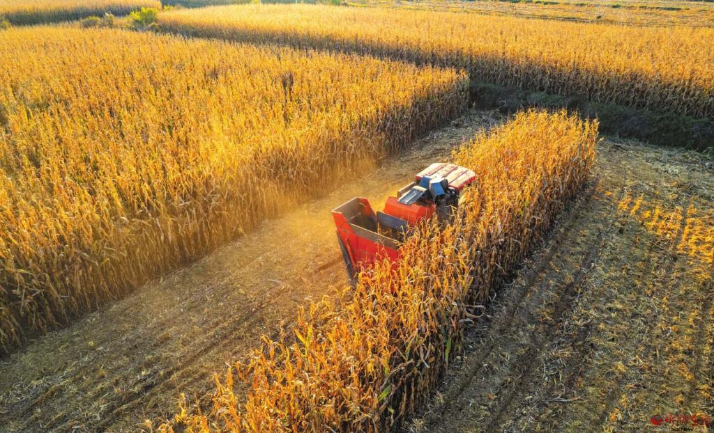 近日,原平市崞陽鎮(zhèn)下韓村村民正在緊張有序地?fù)屖沼衩?,確保秋糧顆粒歸倉(cāng)。 (