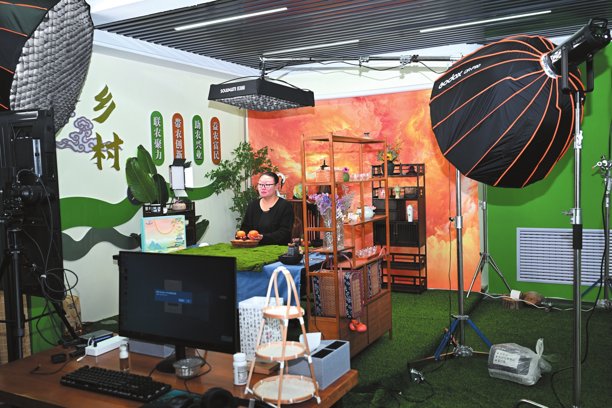五臺(tái)縣臺(tái)城鎮(zhèn)充分發(fā)揮到村工作大學(xué)生的知識(shí)優(yōu)勢(shì),積極建起電商中心,已重點(diǎn)推出陽白鄉(xiāng)蜂蜜、陳家莊花椒、臺(tái)城鎮(zhèn)六道木文創(chuàng)手串三類12種產(chǎn)品,日均銷售6000元,單日成交額最高達(dá)3萬元。圖為主播直播帶貨賣柿子。(金俊賢攝)