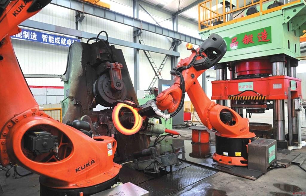 定襄縣秉持“綠色發(fā)展,科技創(chuàng)新”理念,大力推進(jìn)法蘭鍛造行業(yè)的裝備升級換代,變精密制造為智能制造。全縣二十多家企業(yè)實(shí)現(xiàn)生產(chǎn)智能化改造,生產(chǎn)效率提高了百分之五,成本降低了百分之六,經(jīng)濟(jì)效益大幅提高。圖為山西良品鍛造有限公司法蘭流水線機(jī)器人智能化生產(chǎn)作業(yè)。(張晉蘭攝)