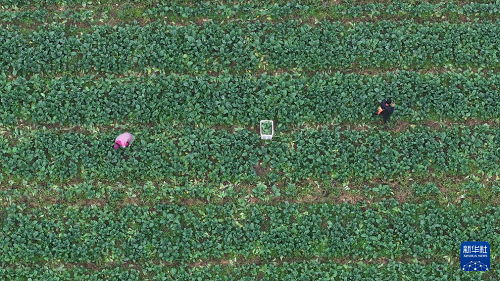 10月30日,菜農在沅江市草尾鎮(zhèn)樂園村蔬菜田里采收蔬菜(無人機照片)。(新華社記者 陳振海 攝)