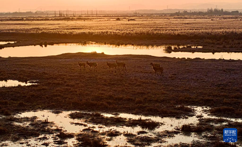 這是11月4日在寧夏青銅峽庫區(qū)濕地自然保護(hù)區(qū)內(nèi)拍攝的麋鹿和麋鹿幼崽(中)。(新華社記者 楊植森 攝)
