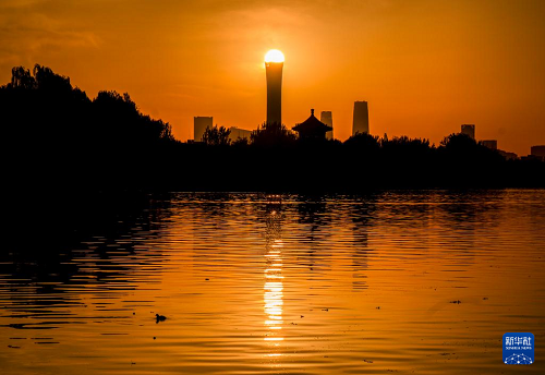 11月10日清晨,北京上空晨曦微露,霞光滿(mǎn)天。中國(guó)尊、望海樓等地標(biāo)建筑在晨光中與什剎海光影交錯(cuò)。
