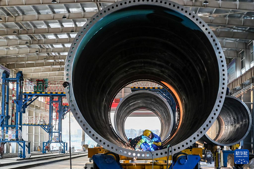 11月20日,在甘肅省酒泉經(jīng)濟(jì)技術(shù)開(kāi)發(fā)區(qū)的中國(guó)水電四局(酒泉)新能源裝備有限公司塔筒制造車間,工作人員進(jìn)行風(fēng)機(jī)塔筒焊接作業(yè)。(新華社記者 郎兵兵 攝)