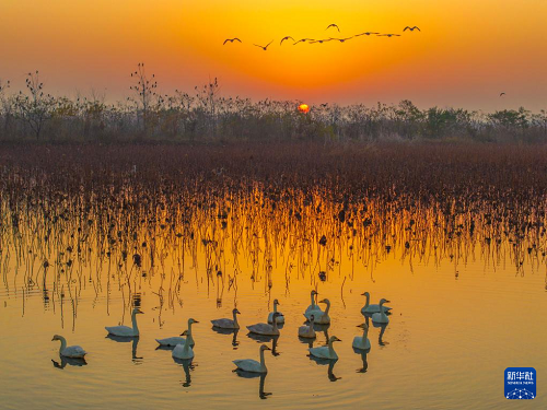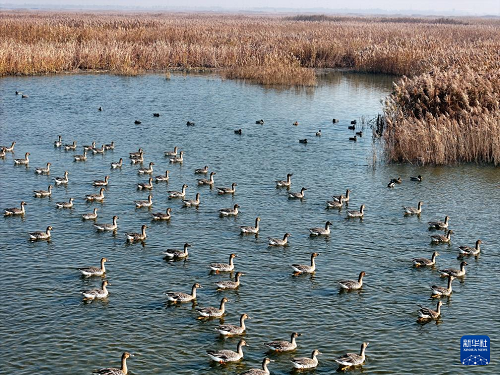 11月30日,群鳥在江蘇興化里下河國家濕地公園內(nèi)棲息、覓食(無人機照片)。(新華社發(fā) 周社根 攝)
