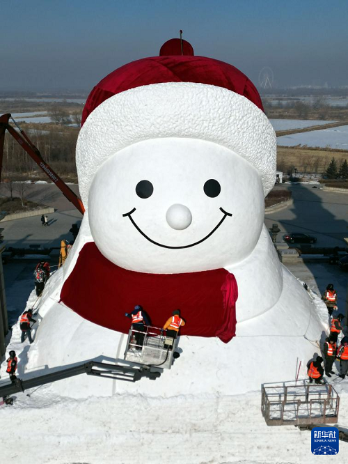 12月14日,正在建設(shè)中的哈爾濱群力音樂公園網(wǎng)紅大雪人頭部已完成,露出憨態(tài)可掬的笑容。今年回歸的大雪人將在保留紅帽子、紅圍脖、紅色愛心紐扣“經(jīng)典皮膚”的基礎(chǔ)上,再次升級。設(shè)計身高19米、長14米、寬11米,比往年“長高”1米,總用雪量超過3000立方米,比往年增加1200立方米,達到歷年之最。
