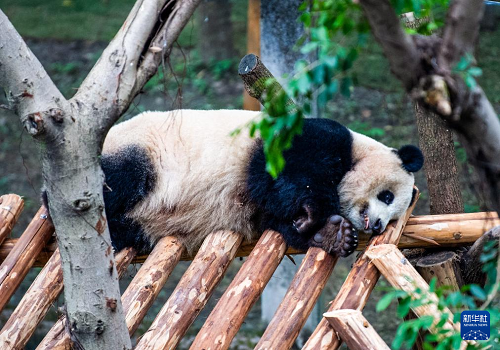 12月22日,入住的大熊貓?jiān)诔灾褡?。(新華社記者 唐奕 攝)