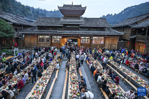 在貴州省黎平縣肇興侗寨,侗族同胞與來賓在侗年活動中共享長桌宴(12月20日攝)。(新華社記者 楊文斌 攝)