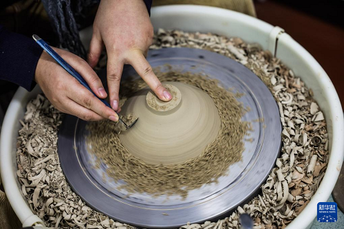 12月24日,侯夢露在位于匡堰鎮(zhèn)倡隆村的楝樹下藝術(shù)村落的東岙窯陶瓷藝術(shù)工作室內(nèi)進(jìn)行青瓷制作流程中的修坯。(新華社記者 徐昱 攝)