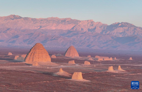 寒冬時節(jié),晨曦中的西夏陵與繽紛霞光及峰巒疊嶂的賀蘭山共同形成雄偉壯麗的景觀。