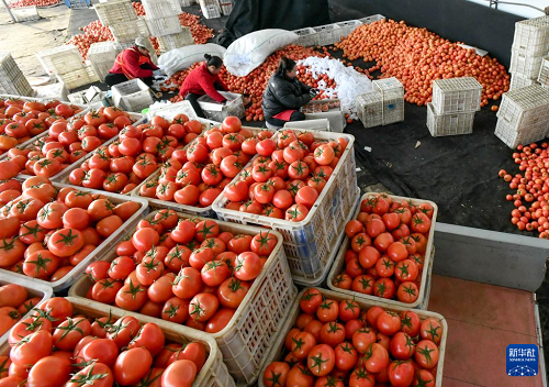 12月29日,肅寧縣萬里鎮(zhèn)一家蔬菜種植合作社的社員在分揀收獲的西紅柿。(新華社記者 楊世堯 攝)