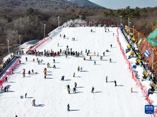 1月11日,游客在江蘇省句容市寶華山滑雪場滑雪(無人機(jī)照片)。(新華社記者 季春鵬 攝)