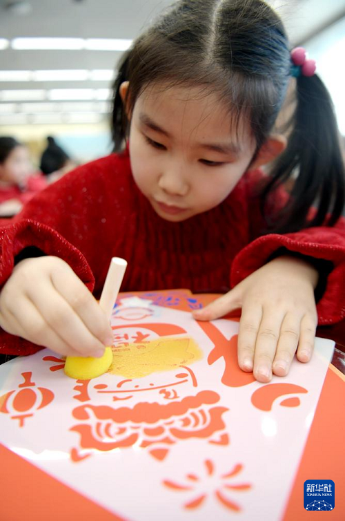 2月11日,在河南省鶴壁市圖書館,一名小朋友制作手工拓印作品。(新華社發(fā) 趙永強(qiáng) 攝)