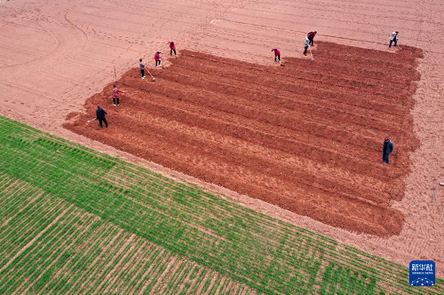 2月25日,河南省沁陽市王曲鄉(xiāng)東王曲村,農(nóng)民在田間整地作畦(無人機照片)。(新華社發(fā) 楊帆 攝)
