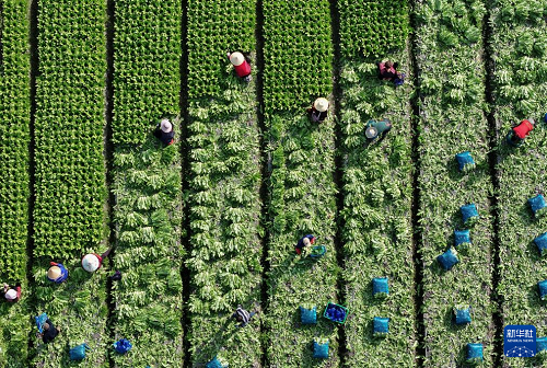 2月24日,農(nóng)民在四川成都市彭州市九尺鎮(zhèn)玉源社區(qū)的田地里采收油麥菜(無人機照片)。(新華社發(fā) 羅國楊 攝)