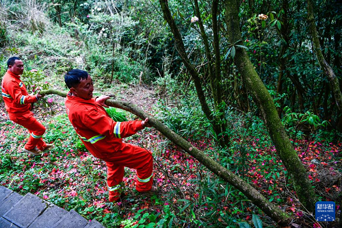 在貴州百里杜鵑管理區(qū)金坡景區(qū),森林防火隊員們在巡邏途中清理一棵倒伏的杜鵑樹(4月2日攝)。(新華社記者 楊文斌 攝)