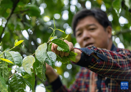 4月11日,重慶市南川區(qū)德隆鎮(zhèn)茶樹村,茶農(nóng)在古茶樹上細(xì)心挑選優(yōu)質(zhì)茶芽。(新華社發(fā) 羅川 攝)