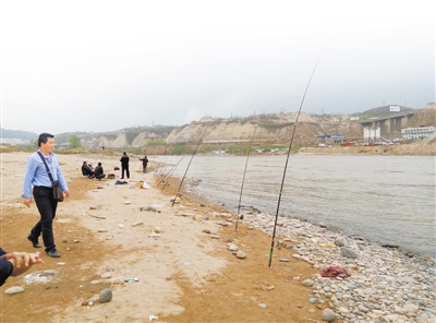 當日下午3時許,蘭州晨報記者在雁白大橋西側(cè)的黃河岸邊看到12把魚竿一字排開,3名釣魚者坐在旁邊沙灘上正在等待魚兒上鉤,還有兩名中年男子正在周圍撒網(wǎng)。在相隔十多米處,記者發(fā)現(xiàn)還有兩名男子分別撐著魚竿釣魚,有一名捕魚者在撒網(wǎng)。“這是雙面粘漁網(wǎng),河內(nèi)稍大一些的魚兒只要撞進網(wǎng)里就擺脫不了?!币幻遏~男子得意地說。