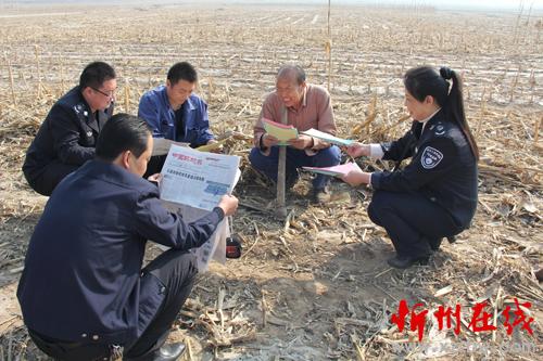 怎樣把《中華人民共和國大氣污染防治法》和《五臺縣人民政府嚴防森林火災的通告》宣傳到人?五臺縣環(huán)境保護局、環(huán)境監(jiān)察大隊分組劃片,組織環(huán)保人員深入到田間地頭,面對面讀報給農民聽,手遞手散傳單讓農民看,為農民解釋燒秸稈、燒地堰、燒荒等野外違規(guī)用火行為的危害。臺城鎮(zhèn)西關村66歲的農民張存在就高興地對縣環(huán)境監(jiān)察人員說:“你們這樣解釋,咱懂,“地頭環(huán)保”咱農民也記得牢,我家4畝地的秸稈保證不燒一根,咱漚糞去,多打糧,又不污染。”圖為地頭宣傳環(huán)境保護,增強農民環(huán)保意識。(金俊賢 攝)