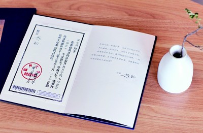 在溫州大學(xué)本科招生錄取現(xiàn)場(chǎng),一本本藍(lán)色燙金的錄取通知書正整整齊齊地?cái)[放在會(huì)議桌上,整裝待發(fā)。通知書整體采用中國(guó)傳統(tǒng)文書褶子樣式,封面是燙金的“錄取通知書”和學(xué)校?;?,封底是王蒙題詞的校訓(xùn)“求學(xué)問是,敢為人先”。展開五折折頁,正面分別是瑞安市東源村木活字傳承人親手印刷的錄取證書頁、校長(zhǎng)寄語、校歌,背面則是以溫州地理標(biāo)志大羅山為底、溫大建筑為前景的山水畫卷。