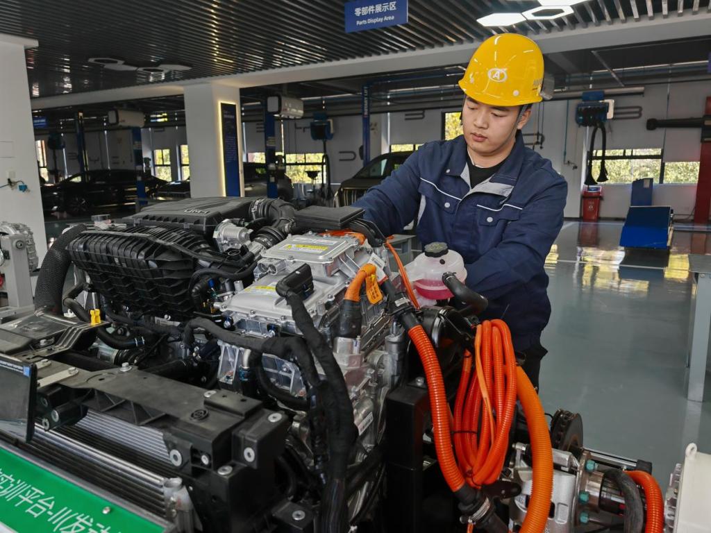 為支撐新能源汽車產(chǎn)業(yè)崛起,河南省全省高職院校開設(shè)相關(guān)專業(yè)點419個,相關(guān)在校生22.14萬人。在河南機電職業(yè)學院與比亞迪共建的現(xiàn)場工程師學院,圍繞“現(xiàn)場工程師”培養(yǎng)開發(fā)了37門項目化課程。該校每年向鄭州航空港區(qū)比亞迪工廠輸送1000余名技能人才,不少學生迅速成長為產(chǎn)線骨干。“學校通過‘項目+人才’雙交付育人模式,極大地增強了人才培養(yǎng)與企業(yè)需求的匹配度?!北葋喌峡傃b車間主任如是說。