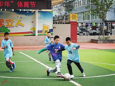 當(dāng)天下午,太原市雙東小學(xué)的大課間鈴聲準(zhǔn)時響起——“走,練射門去!”六年級學(xué)生張浩宇一把抓起足球,和隊友們直奔操場。上、下午各30分鐘的陽光大課間正有序開展,韻律操、武術(shù)操的音樂響徹校園。