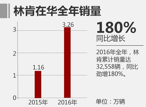 在陸續(xù)引入四款新車后,隨著產品線的逐漸豐富,開始走“親民”路線的林肯在重回中國市場后銷量大幅攀升。較之2015年的11,630輛,2016年全年林肯累計銷量達32,558輛,同比勁增180%,其增速成為中國成長最快的豪華品牌。在第四季度,林肯單月銷量達11,562輛,占全年銷量的35.5%,同比增幅162%。