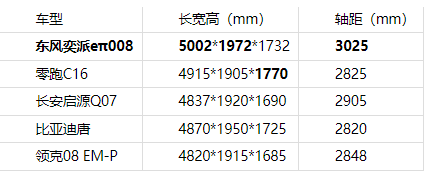 家庭出游的核心訴求是“全員舒適”,空間表現(xiàn)直接影響乘坐體驗(yàn)。在這一點(diǎn)上,東風(fēng)奕派eπ008交出了亮眼答卷,超5米的車長(5002mm)與超3米的軸距(3025mm)全面碾壓同級(jí)競品。五款車型中,東風(fēng)奕派eπ008是唯一一款車長超過5米、軸距超過3米的車型。更高級(jí)別的車長和軸距,帶來了更充裕的縱向空間,確保每位乘客皆可舒展身姿,盡享愜意旅途。