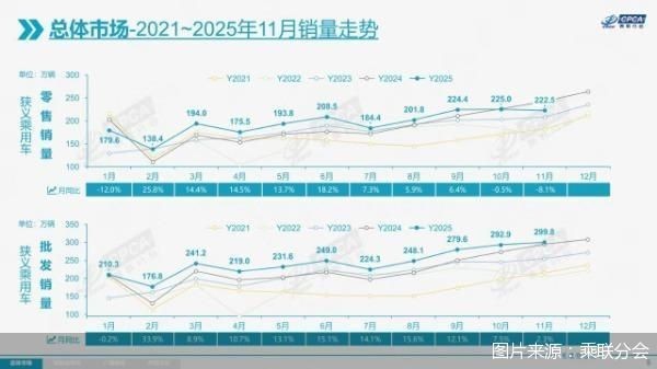 車市正進入平穩(wěn)發(fā)展階段。12月8日,中國汽車流通協(xié)會乘用車市場信息聯(lián)席分會(以下簡稱“乘聯(lián)分會”)發(fā)布的數(shù)據(jù)顯示,2025年前11個月零售2148.3萬輛,整體保持增長。不過,今年11月車市零售量同比、環(huán)比均出現(xiàn)下滑?!?1月乘用車市場銷量環(huán)比出現(xiàn)下降,是比較少見的?!背寺?lián)分會秘書長崔東樹認為,今年上半年,我國乘用車市場銷量實現(xiàn)較快增長,下半年車市增長需回到合理、穩(wěn)定的狀態(tài)。車市進入平穩(wěn)期有利于市場長期穩(wěn)定發(fā)展,預計今年零售將增長5%。