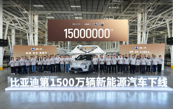 2025年12月18日,比亞迪第1500萬輛新能源汽車下線儀式在濟南工廠順利舉行,“大六座安全豪華SUV”騰勢N8L成為第1500萬輛下線車型,這也是騰勢N8L的第15000輛下線。比亞迪達成這一里程碑,用了整整17年,從1000萬到1500萬,只用了短短的13個月,再次刷新中國新能源汽車的“加速度”,也標志著中國汽車工業(yè)正式邁入全球引領新階段。