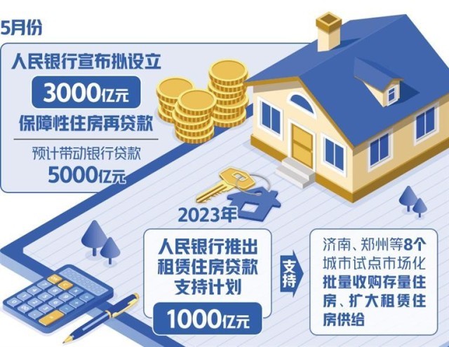 5月,人民銀行宣布擬設立3000億元保障性住房再貸款,按照“政府主導、市場化運作”的思路,由中國人民銀行提供低成本再貸款資金,激勵21家全國性銀行機構按照市場化、法治化原則,支持地方國有企業(yè)以合理價格收購已建成存量商品房,用作配售型或配租型保障性住房,預計帶動銀行貸款5000億元。