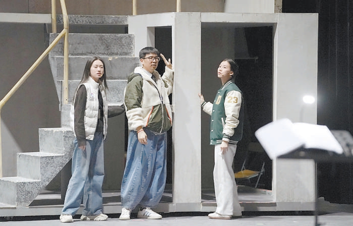 李佳軒(中)在給兩位演員說戲。北京日?qǐng)?bào)記者 方非攝