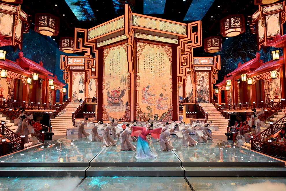 近年來,遼寧春晚不斷將獨(dú)特的區(qū)域文化深度融入節(jié)目中。2023年復(fù)刻遼代壁畫《散樂圖》,2024年以查海遺址“石堆塑龍”為靈感創(chuàng)作節(jié)目《龍騰》,2025年從《簪花仕女圖》中提取意象打造詩畫舞蹈……遼寧春晚正在成為東北文化的講述者。