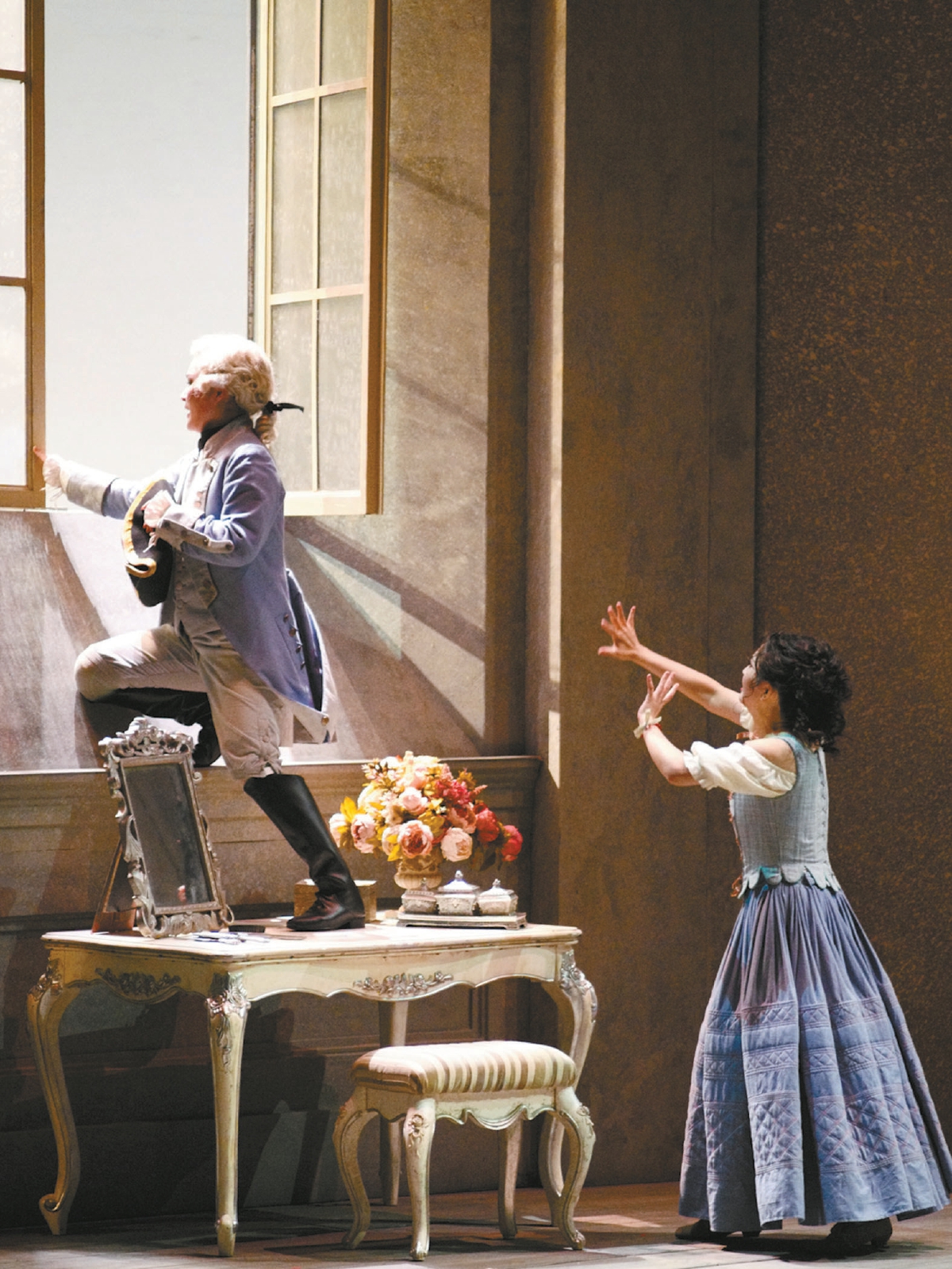 奧地利男中音馬庫(kù)斯·維爾巴飾演的費(fèi)加羅一登場(chǎng)便贏得滿(mǎn)堂喝彩。他以渾厚圓潤(rùn)的音色與精湛的表演技巧,將這位機(jī)智勇敢的男仆形象刻畫(huà)得入木三分。在詠嘆調(diào)“如果你想跳舞”中,維爾巴與國(guó)家大劇院合唱團(tuán)的默契配合將劇情推向首個(gè)高潮,合唱團(tuán)飽滿(mǎn)和諧的和聲為音樂(lè)增添了絢麗色彩。第一幕結(jié)尾處,維爾巴演唱的著名詠嘆調(diào)“再不要去做情郎”以明快有力的旋律與溫柔勸導(dǎo)的宣敘調(diào)交替呈現(xiàn),生動(dòng)展現(xiàn)了費(fèi)加羅幽默風(fēng)趣與堅(jiān)定勇敢的雙重性格,鏗鏘有力的演唱贏得全場(chǎng)掌聲雷動(dòng)。
