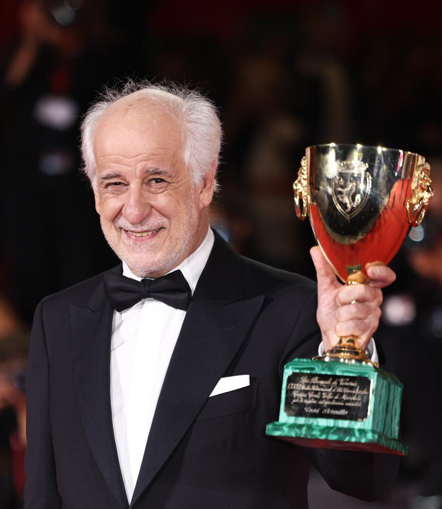 9月6日,在意大利威尼斯,最佳男演員獎獲得者、電影《恩典》演員托尼·瑟維洛與獎杯合影。新華社記者 李京 攝