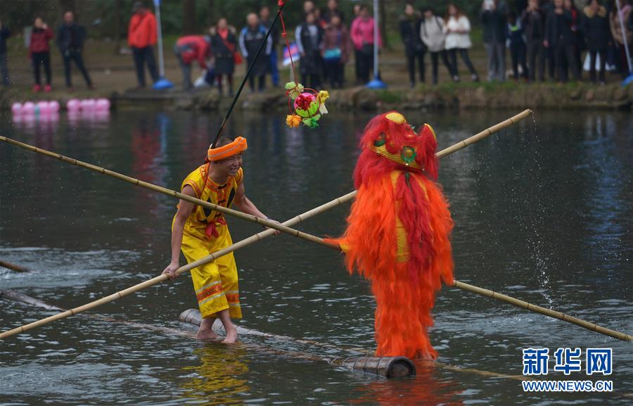 1月1日,“獨(dú)竹漂”愛好者在花溪河上表演水上高難度平衡動(dòng)作。 2016年元旦,在貴陽市花溪公園平橋河段舉行的貴陽市第31屆冬泳表演活動(dòng)中,數(shù)十名“獨(dú)竹漂”愛好者在花溪河上腳踏漂浮的竹竿,表演“金雞獨(dú)立”、轉(zhuǎn)身平衡等高難度動(dòng)作,讓觀眾大飽眼福。新華社發(fā)(秦剛 攝)