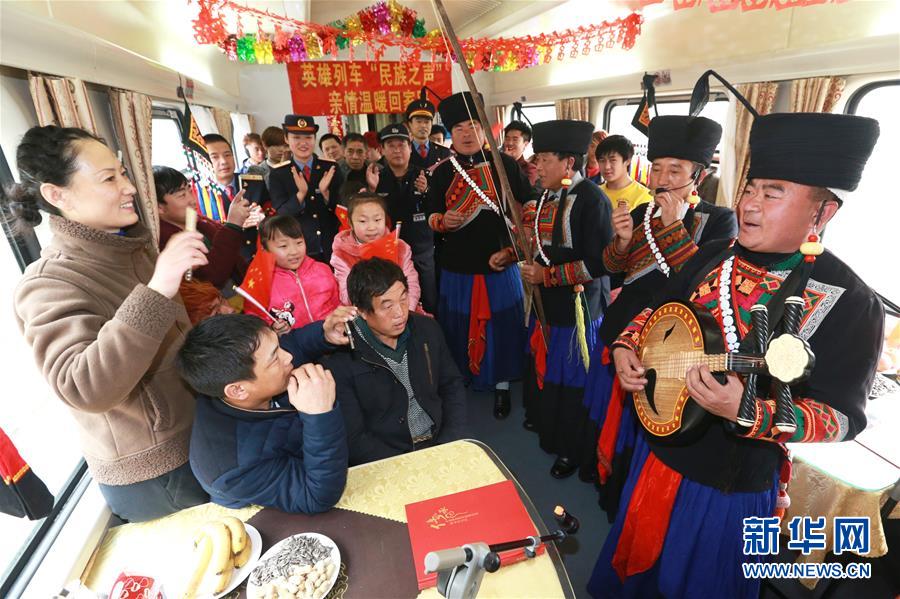 2月1日,彝族藝術(shù)家在K165次列車上為旅客表演。當(dāng)日,在西安鐵路局西安至昆明的K165次列車上,四川美姑縣原生態(tài)畢摩樂隊與西安客運段職工民樂小分隊聯(lián)合舉辦“英雄列車民族之聲親情溫暖回家路”音樂會,畢摩樂隊用口弦、哈門、木葉、瑪布等彝族民間樂器演奏的音樂為返鄉(xiāng)過年的旅客提前送上新年祝福。民間藝術(shù)家和列車乘務(wù)員還為旅客們送上“福”字、春聯(lián)。新華社發(fā)