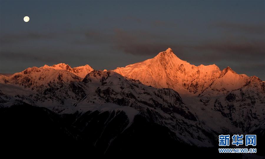 這是3月25日清晨拍攝的梅里雪山“日月同輝”景觀。梅里雪山位于滇藏交界的云南省迪慶藏族自治州德欽縣境內(nèi),是世界自然遺產(chǎn)“三江并流”的主要自然景觀之一。梅里雪山常年云霧籠罩,太陽(yáng)光只在少數(shù)天晴的清晨照射在雪山頂上,形成絕美的“日照金山”美景。有時(shí)月亮尚未落山,太陽(yáng)已經(jīng)升起,更是形成了難得一見的梅里雪山“日月同輝”奇觀。新華社記者 王長(zhǎng)山 攝