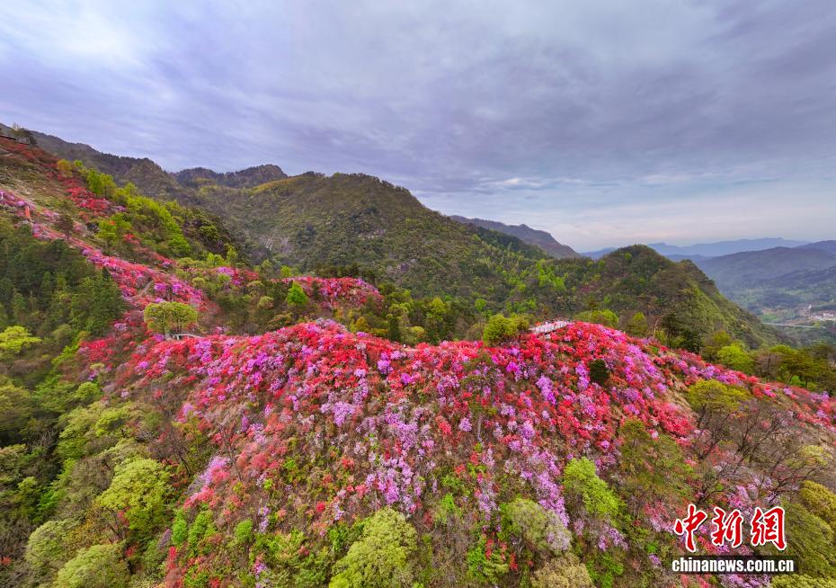 清明假期,位于大別山腹地的安徽省安慶市岳西縣河圖鎮(zhèn)天峽風景區(qū)內(nèi),千畝野生高山杜鵑迎來最佳觀賞期。漫山遍野的杜鵑花海沿山脊鋪展,紅、粉、紫、白各色花朵競相綻放,將大別山腹地裝點成一幅絢麗的春日畫卷。圖為4月5日杜鵑花盛開景色。