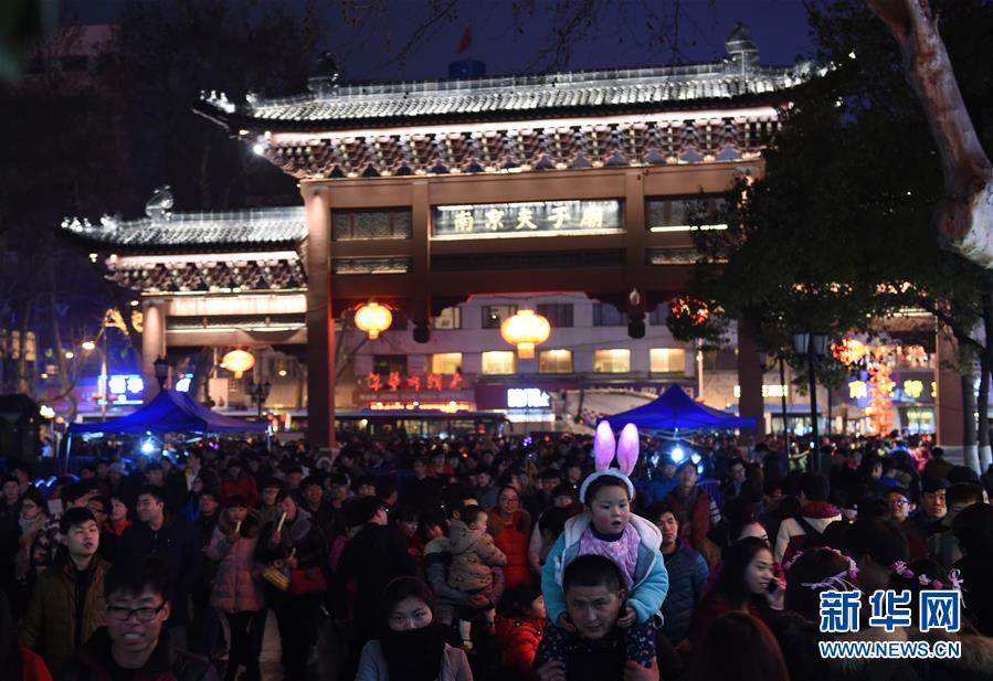 2月22日晚,游人在夫子廟景區(qū)觀燈游玩。當(dāng)晚,在江蘇南京夫子廟秦淮風(fēng)光帶舉辦的秦淮燈會(huì)彩燈齊放,人們前來(lái)觀燈鬧元宵。 新華社記者孫參攝