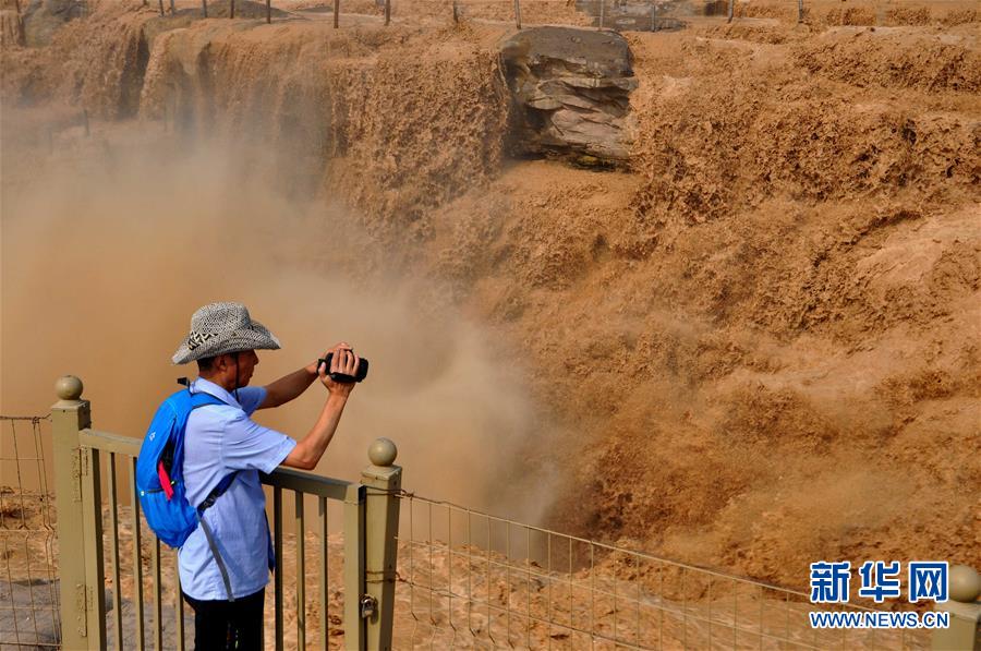 7月4日,一名游客在山西吉縣拍攝奔騰洶涌的黃河壺口瀑布。當日,受上游降雨和水庫調(diào)節(jié)放水影響,黃河晉陜峽谷迎來入汛以來第一次漲水,壺口瀑布水量大增,再現(xiàn)壯美大瀑布,吸引了眾多游客。新華社發(fā)(呂桂明 攝)