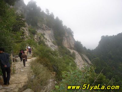 北武當(dāng)山主峰四周幾乎都是陡壁懸崖,只有一條人造“天梯”可攀。來(lái)到山腳下,過(guò)五里黃土、五里沙路,便是1400余級(jí)就山鑿筑的石階,凡險(xiǎn)峻之處,設(shè)有鐵索扶手。石階一線(xiàn)疊置,從下仰視,宛如“天梯”。游人攀登,每一步都可聽(tīng)到悠揚(yáng)頓挫的“石音”,形成獨(dú)特的“石樂(lè)”絕景。沿著石階,奇松異石、廟宇石刻,掩沒(méi)在蔥郁的山林植被之中,相間點(diǎn)綴,相映成趣。主要的山石景觀有:古猿望日、石豬受難、九龍出洞、石象守山、天壺傾露、石羊朝圣、石龜下蛋、石虎、石蛤蟆、龜蛇斗智等。最令人稱(chēng)奇的是“龜蛇斗智”奇觀,相傳神龜和青蛇不安心修道,互相格斗,經(jīng)過(guò)七七四十九天的麈戰(zhàn),神龜節(jié)節(jié)敗退,青蛇步步緊逼。其時(shí),恰逢真武大帝返宮,見(jiàn)狀,輕輕用手指一點(diǎn),龜蛇便動(dòng)彈不得,從此永久停留在這里,成千古一絕——“蛇石”虎視眈眈,“龜石”尾臨懸崖,萬(wàn)斤重石,峭立崖畔,用力一推或經(jīng)風(fēng)一吹,便搖搖欲墜,令人心懸,所以又稱(chēng)風(fēng)動(dòng)石,為我國(guó)罕見(jiàn)的景觀之一。主要的奇松景觀有:鴛鴦松、迎客松、托天松、母子松等。最使人嘆為觀止的是“擎天探海松”,其松立于石階半道,樹(shù)身技分兩杈,一直刺青天,一枝瞰群峰。近金頂?shù)悄咸扉T(mén)石階,旁邊陡崖上刻有“喬松”二字,據(jù)載為清代道光年間永寧州牧王繼賢手跡?,F(xiàn)存喬松樹(shù)樁直徑近1米,可以想見(jiàn)其昔日雄姿。主要的懸崖峭壁有:千仞壁、舍身崖、鷹嘴崖等。還有呈垂直分布的植被,其色彩和花期隨季節(jié)變化,給北武當(dāng)山披上了“春粉、夏艷、秋紅、冬白”的盛裝。登臨武當(dāng)之巔,一覽眾山,但見(jiàn)遠(yuǎn)山蒼茫,近日含黛,松風(fēng)撲面,白云飄逸;只聞松濤陣陣,山泉潺潺,鳥(niǎo)語(yǔ)唧唧,似琴弦輕撥;夏秋之季,如晴空萬(wàn)里,金頂之下,叢林景觀相間,似七彩織錦;白云遠(yuǎn)處,群山連綿,猶如萬(wàn)龍翻騰,極為壯觀。