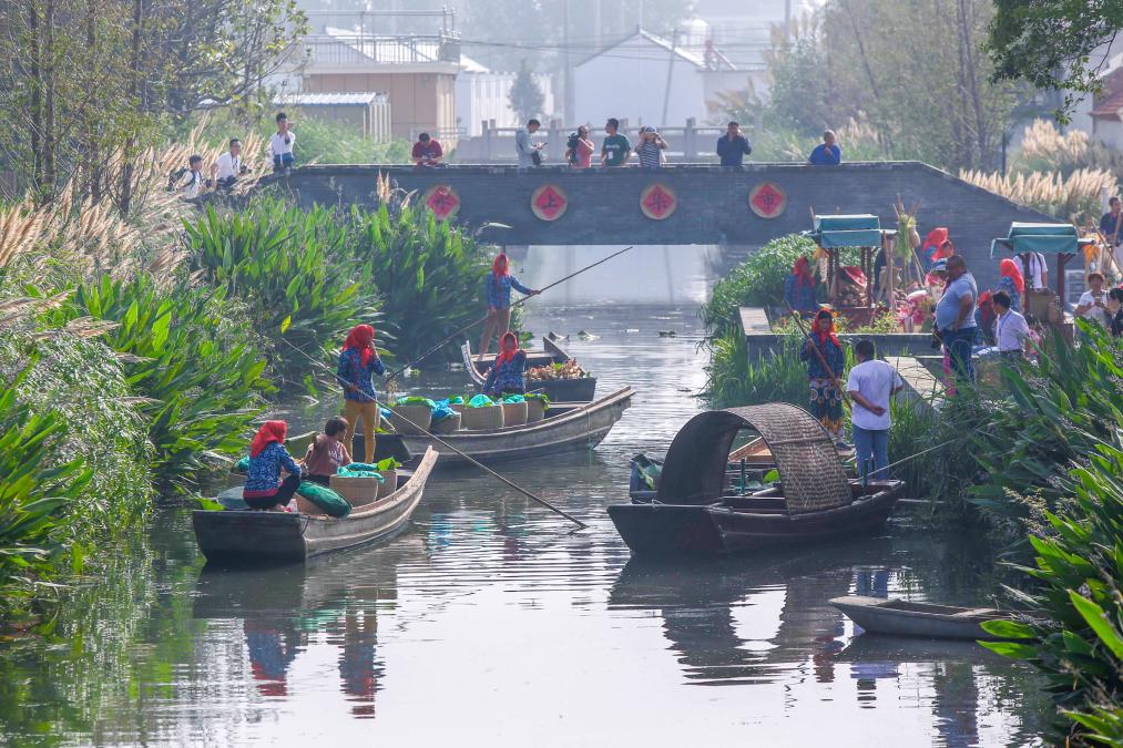 ??2018年9月23日,在江蘇省興化市東羅村舉辦的農(nóng)民豐收節(jié)主題活動上,農(nóng)民在“水上市集”展示特色農(nóng)產(chǎn)品。新華社發(fā)(周社根 攝)