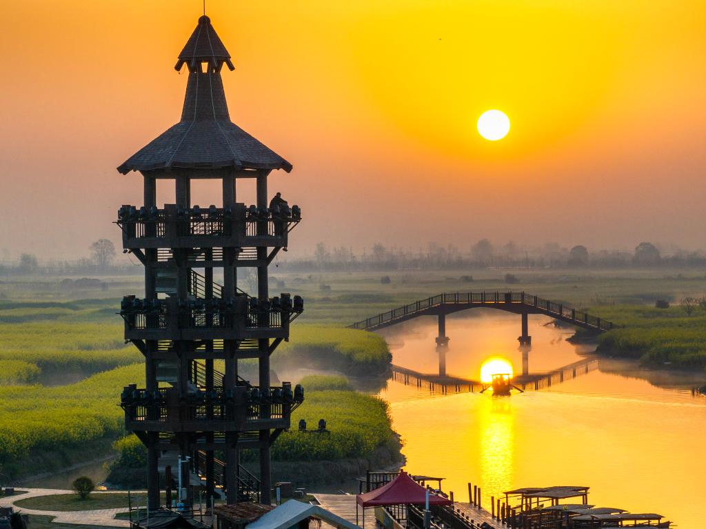 ??2025年4月8日拍攝的江蘇省興化市千垛景區(qū)日出晨景(無人機照片)。新華社發(fā)(周社根 攝)