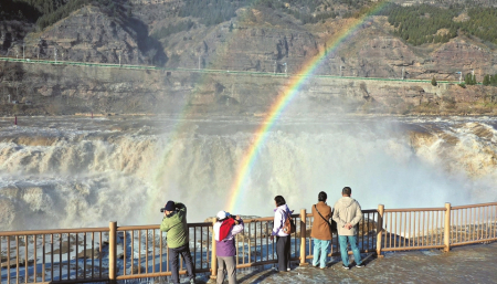 12月3日,游客在吉縣黃河壺口瀑布欣賞“雙彩虹”景觀。初冬時(shí)節(jié),受上游水庫調(diào)節(jié)放水影響,黃河壺口瀑布水量增大,飛濺的水霧經(jīng)陽光照射,形成季節(jié)特有的“雙彩虹”景觀,吸引了眾多游客駐足觀賞。