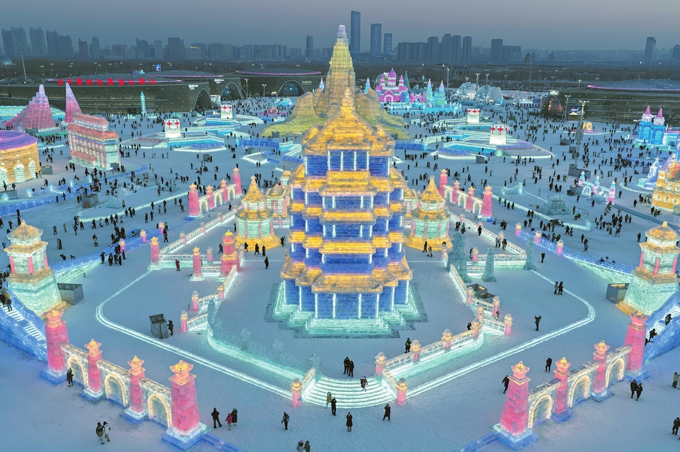 12月17日,游客在哈爾濱冰雪大世界園區(qū)游玩。當(dāng)日上午10時(shí),第二十七屆哈爾濱冰雪大世界正式開園迎客。園區(qū)占地面積達(dá)120萬平方米,總用冰用雪量突破40萬立方米,以歷屆之最的規(guī)模,打造一座冰天雪地的“童話世界”。