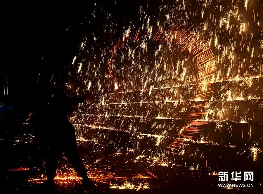 1月12日,河北磁縣開(kāi)始舉行“打鐵花”慶新年活動(dòng)?!按蜩F花”是以小煉鐵爐將生鐵化成鐵水后,用木板將鐵水加鋸末打上天空,鋸末在空中燃燒形成“鐵花火雨”四濺飛揚(yáng)的景象。打鐵花”是當(dāng)?shù)貧v史悠久的民俗娛樂(lè)活動(dòng)。新華社發(fā) (趙鴻宇 攝)