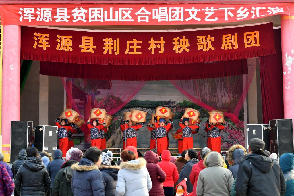 ↑1月3日,在山西省渾源縣荊莊村,村民們在欣賞渾源縣貧困山區(qū)合唱團(tuán)的演出。