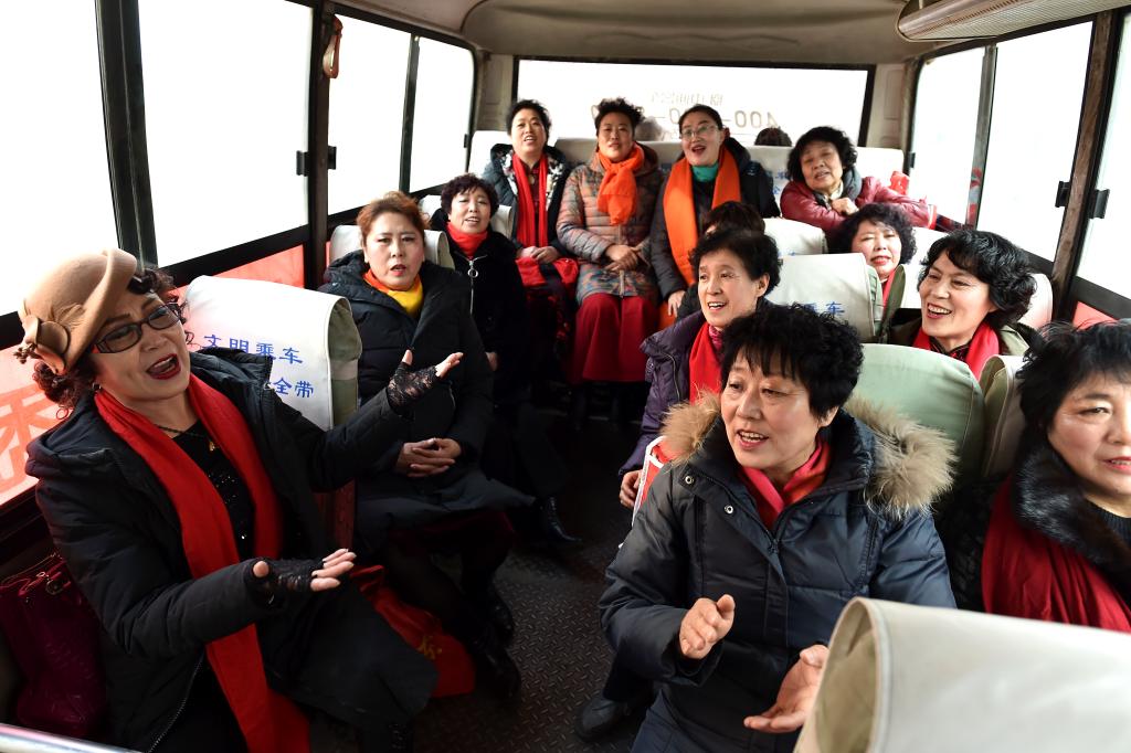 ↑1月3日,渾源縣貧困山區(qū)合唱團(tuán)團(tuán)員們在前往荊莊村的大巴車上排練。