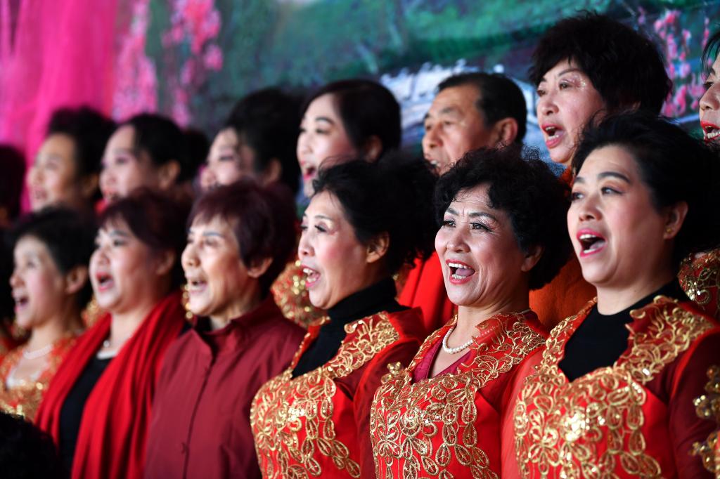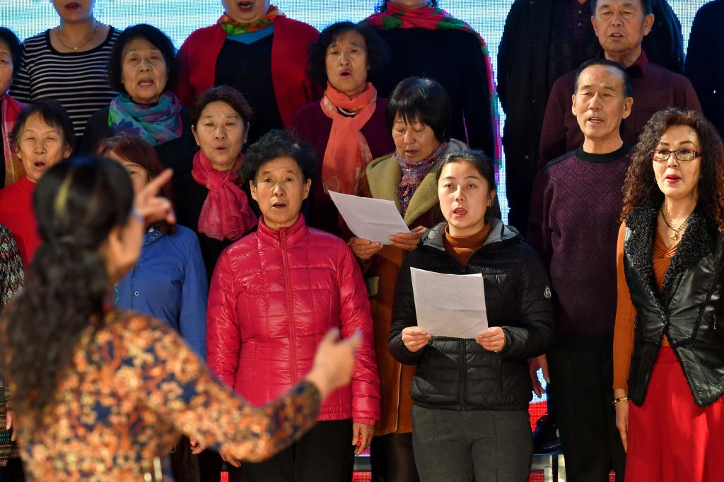 ↑1月3日,在山西省渾源縣荊莊村,渾源縣貧困山區(qū)合唱團(tuán)在表演大合唱《祝福祖國》。