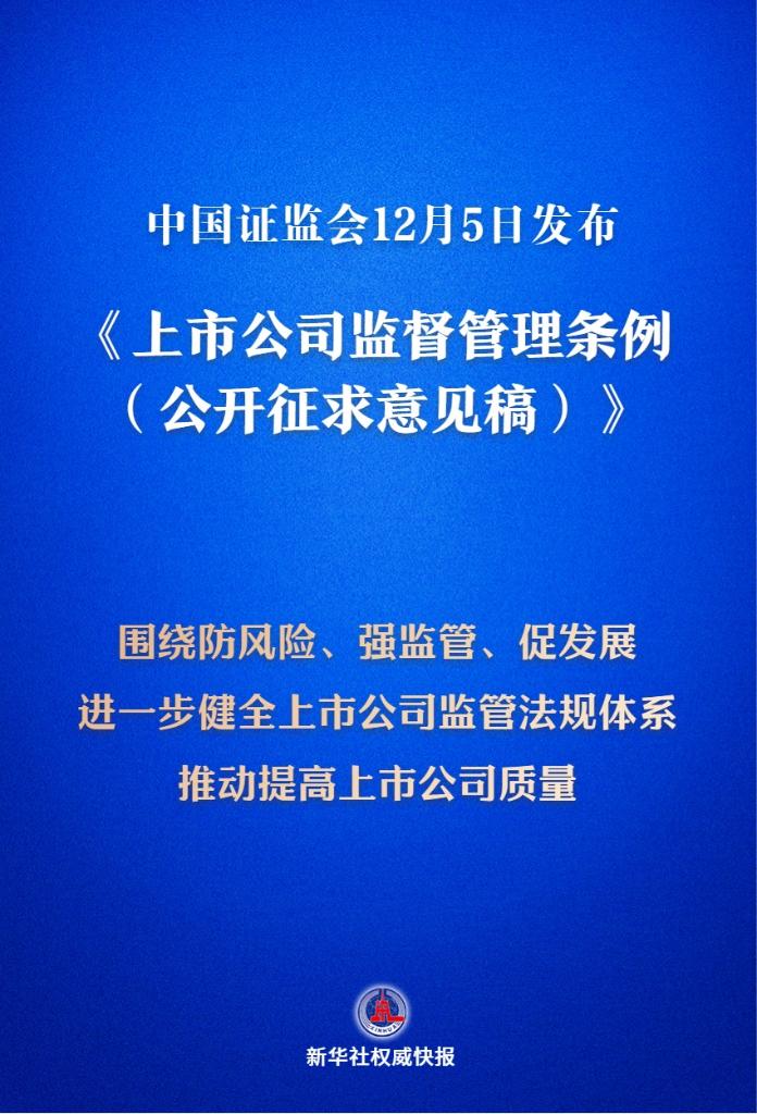 新華社北京12月5日電(記者劉羽佳)中國證監(jiān)會5日發(fā)布《上市公司監(jiān)督管理?xiàng)l例(公開征求意見稿)》,我國將迎來首部專門的上市公司監(jiān)管行政法規(guī)。